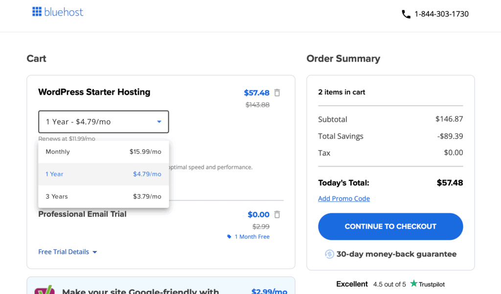 I want to reiterate why you should purchase at least a 12 month hosting plan. Month-to-month is less effective, and I highly recommend signing up for a minimum of 12 months for many reasons. By signing up for a minimum of 12 months, you will receive a free domain name, lower pricing, and you won’t have to deal with an expired website after each month. For example, if hosting is not renewed or if the card expires, then your website is down and you risk losing business (visitors/traffic) when you pay on a month-to-month basis. It’s also exceptionally more expensive to pay month-by-month rather than in one lump sum. The more years you sign up for, the less you pay.