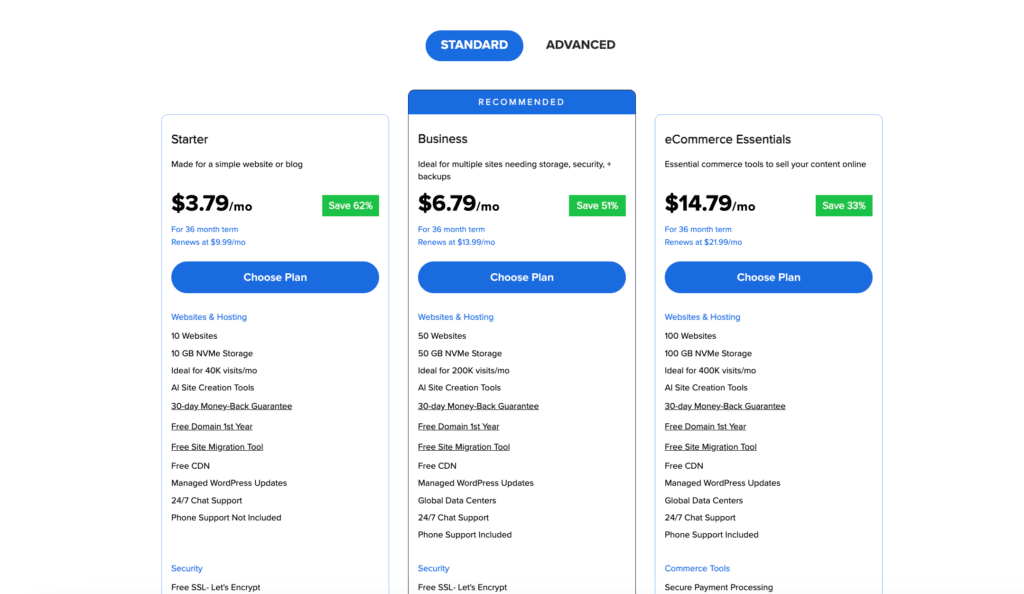 • The lowest price plan is all you really need for now, so skip the Plus and Business Pro plans as they are more expensive. You can always change it later to a different plan if you want to (and just pay the difference), so there is no need to sign up for extra that you do not need.