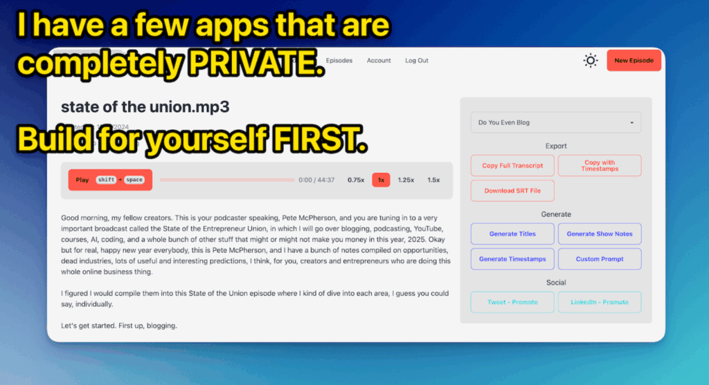 Author bio: Pete McPherson left the corporate world in 2017 to become a full-time online entrepreneur, building 20+ profitable brands, two of which he successfully sold. Over the years, his work has reached millions of people through YouTube, podcasts, and blogs, amassing over 4,000,000 YouTube views and 3,000,000 podcast downloads. Today, Pete teaches creators and entrepreneurs through Code Playbook, his program and YouTube channel dedicated to helping people build and launch apps with AI.