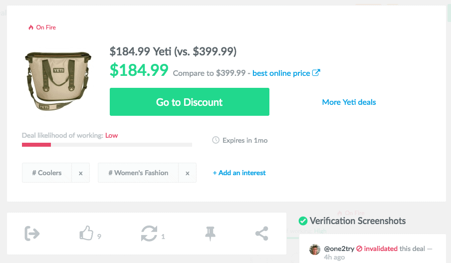 And, what’s nice about Dealspotr is that I can see the “Deal likelihood of working,” the last time it was validated, and the expiration date.